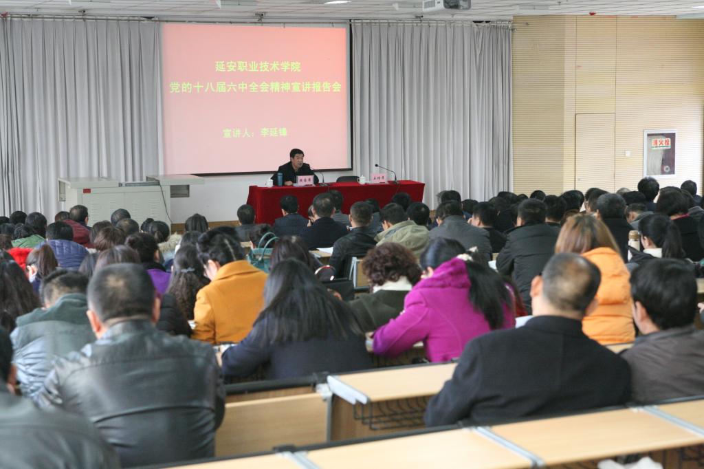 12月7日下午,学院党委邀请市委理论讲师团副团长李延锋同志在第一阶梯教室作了党的十八届六中全会精神宣讲报告。学院院级领导、副科级以上干部、副高以上职称人员和公共课教学部思政教研室全体教师共300多人参加了报告会。党委书记呼世杰主持了报告会。
