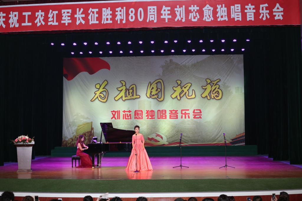 高福华代表学院致辞。他说,在纪念红军长征胜利80周年、延安职业技术学院举行第二届科技文化艺术节之际,我院师范教育系刘芯愈同学在这里举办个人独唱音乐会,既是她个人声乐才艺的汇报,又是师范教育系多年来教学实践成果的检验。我们希望师范教育系培养出更多像刘芯愈这样多才多艺的学生,通过自己的歌声赞美祖国、歌颂长征精神,宣传延安精神。