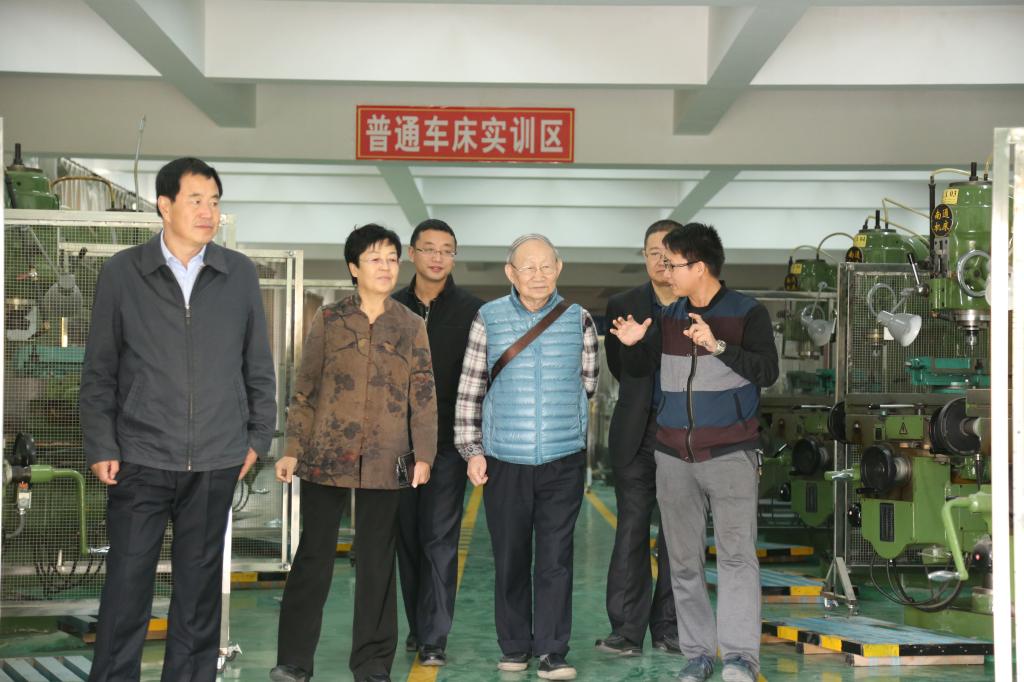 一进学院大门,86岁高龄的曾老顾不得休息,就与迎接他的学院党委副书记、常务副院长高雅琴等了解学院基本情况,根据曾老来意,陪同人员带他到机电工程系实训室及机电实训工厂调研。