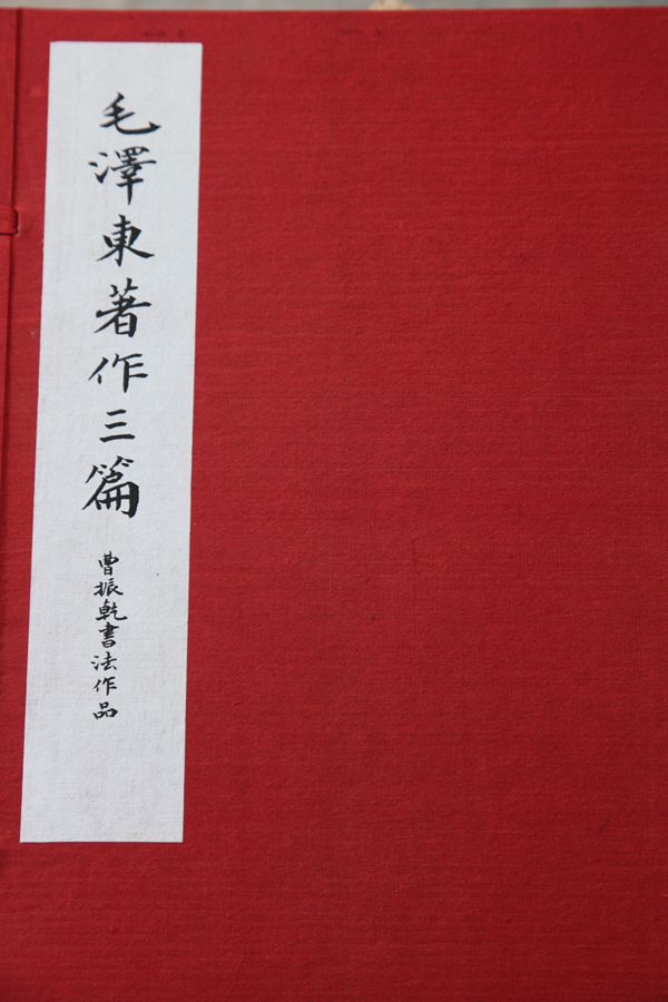 曹振乾,长期从事基层文化工作,业余时间颇好书法,尤擅楷草,临池不断,以“二王”为根基,广涉古代碑帖,苦心钻研,融会贯通,有流转自如,劲健洒脱之感。此次捐赠的这套书是他在毛泽东诞辰一百二十周年之际,楷书了毛泽东在延安凤凰山麓写的《矛盾论》、《实战论》、《论持久战》三篇著作。