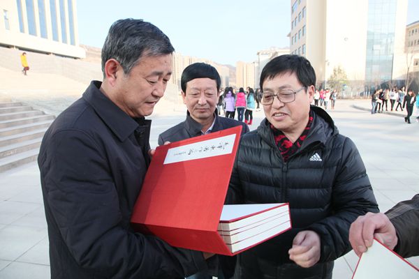 2014年12月22日下午,延安市文化局局长曹振乾为延安职业技术学院捐赠《毛泽东著作三篇·曹振乾书法作品》一书共20套,学院党委书记白生瑞代表学院接受捐赠。学院党政办公室主任白世明、职业技能鉴定站站长熊军林、图书馆馆长李斌参加捐赠仪式。