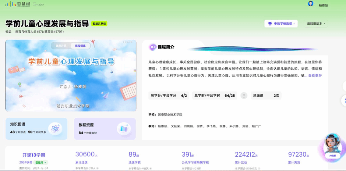 国家在线精品课程是教育部持续推动的信息技术与教育教学深度融合,主动适应数字教育新形势的课程建设项目,属“双高计划”建设的国家级标志性成果之一,代表了我国职教领域课程建设的最高水平。《学前儿童心理发展与指导》是学前教育专业基础课,课程在智慧树平台开课13个学期,选课学校89所,累计选课30600多人。