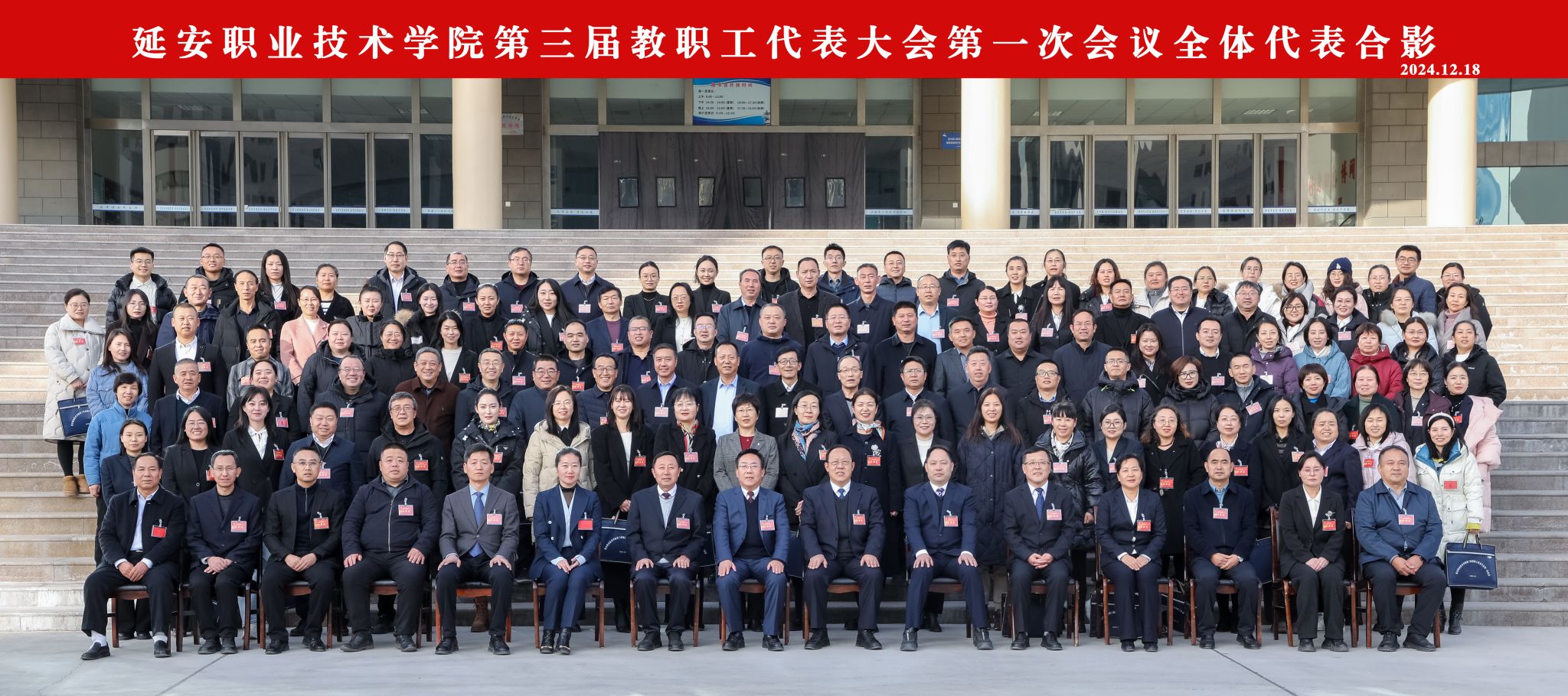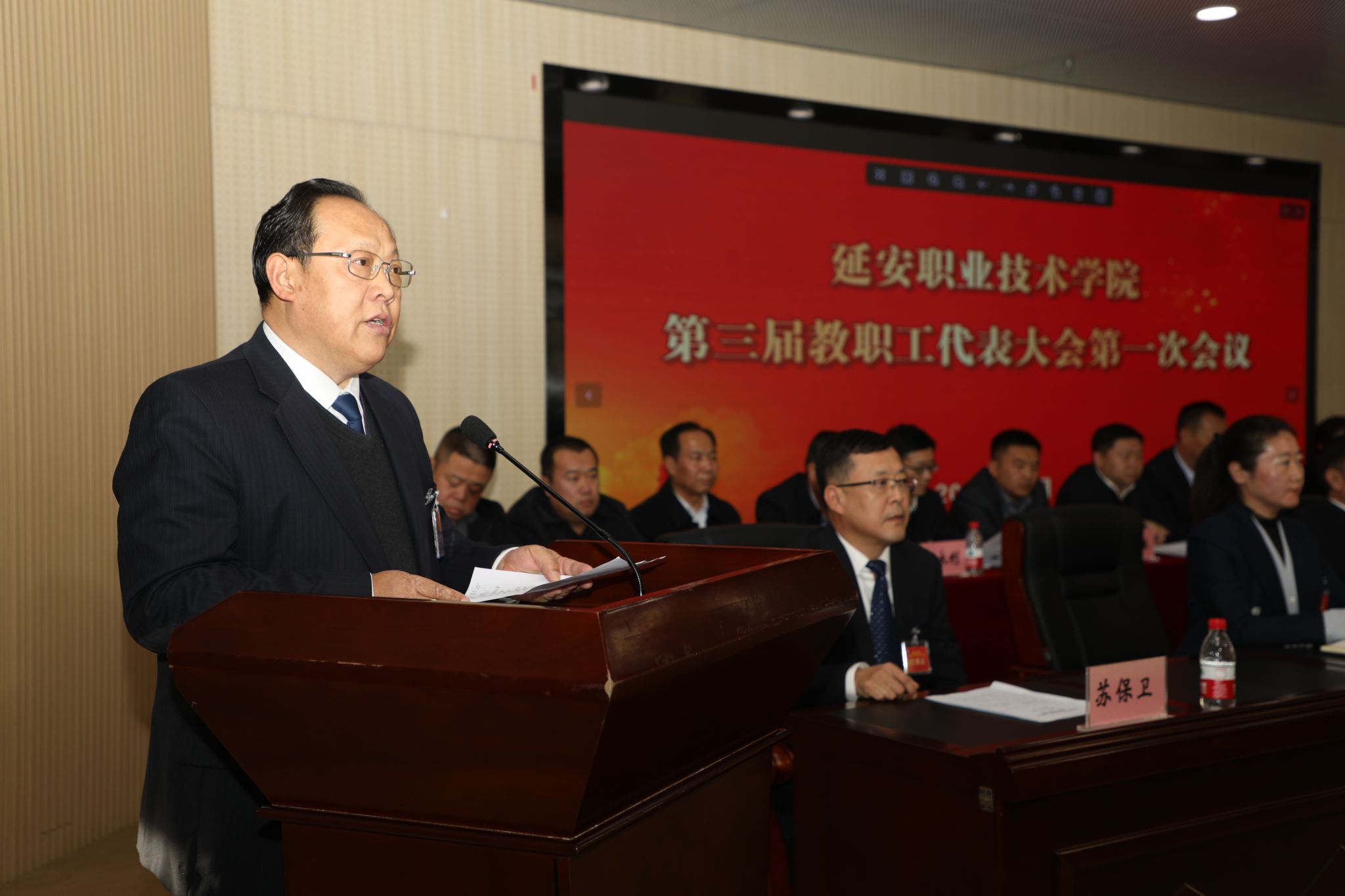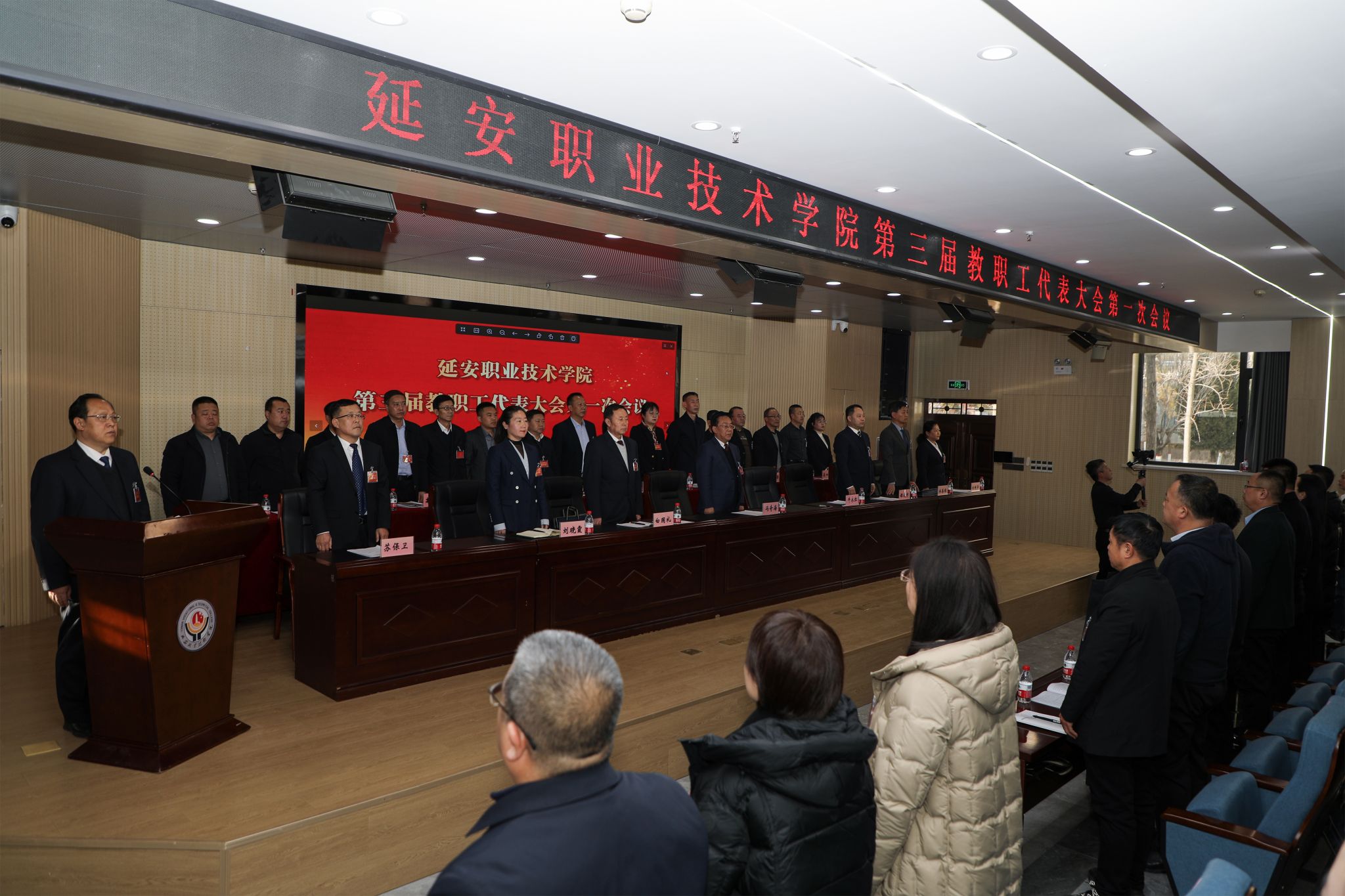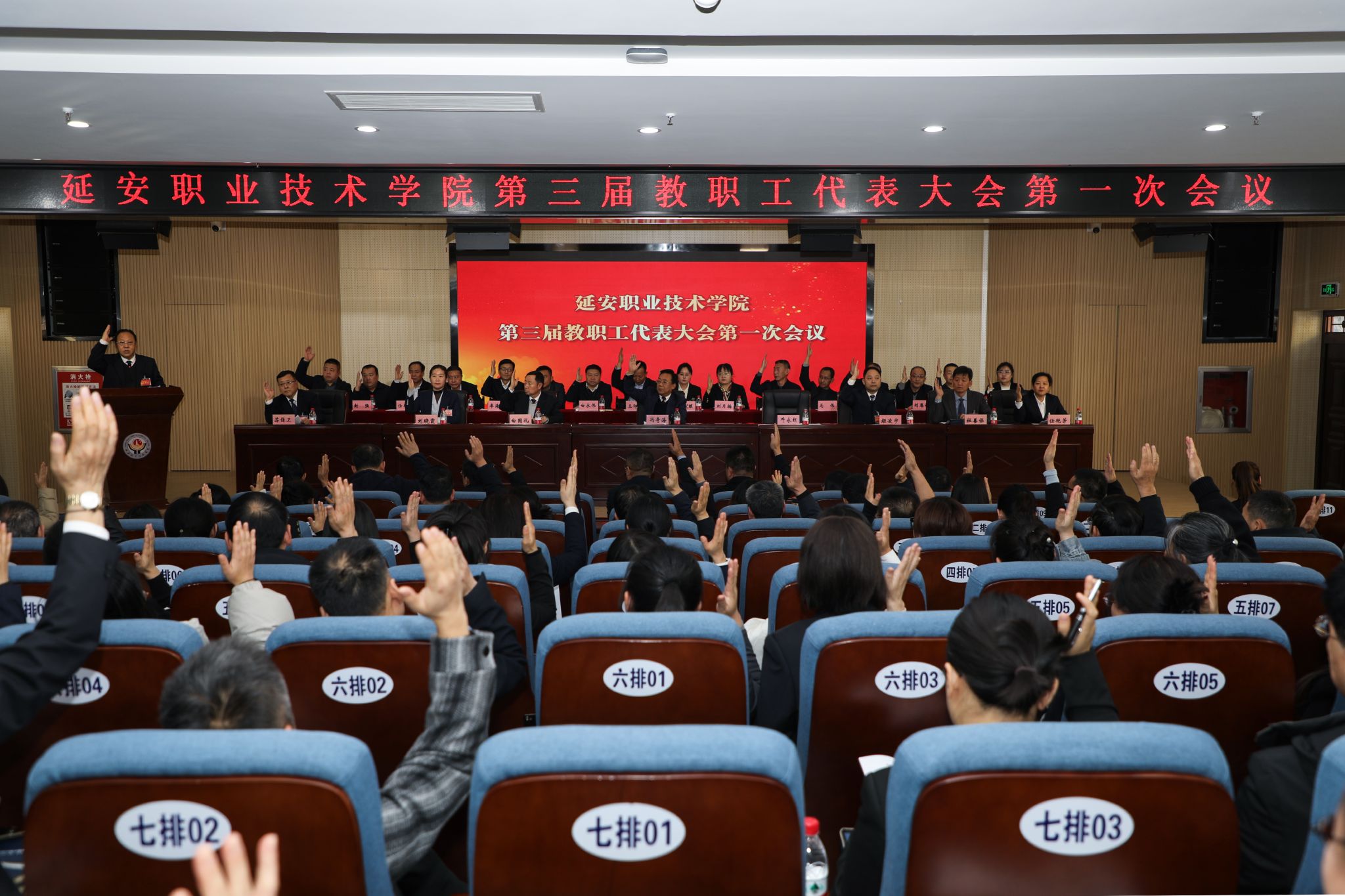 12月18日下午,延安职业技术学院第三届教职工代表大会第一次会议在学术报告厅闭幕。党委书记冯奇海出席会议并讲话,党委副书记、院长牛永红主持闭幕式。党委委员、副院长杜善保向大会报告了各代表团分组讨论情况。党委委员、纪委书记刘晓霞宣读了关于《第三届教职工代表大会第一次会议的决议(草案)》。全体代表举手表决通过了本次教代会决议。本次大会应到代表151名,实到代表137名,符合法定人数。