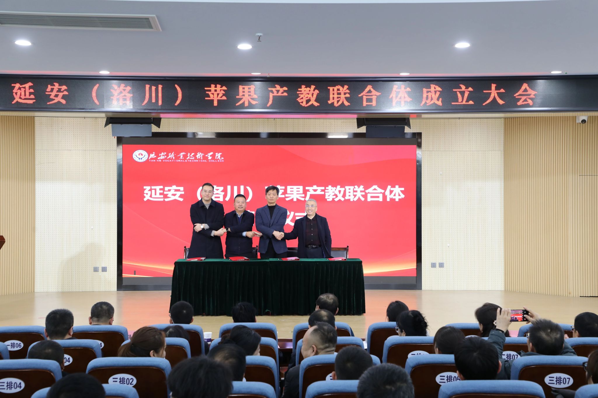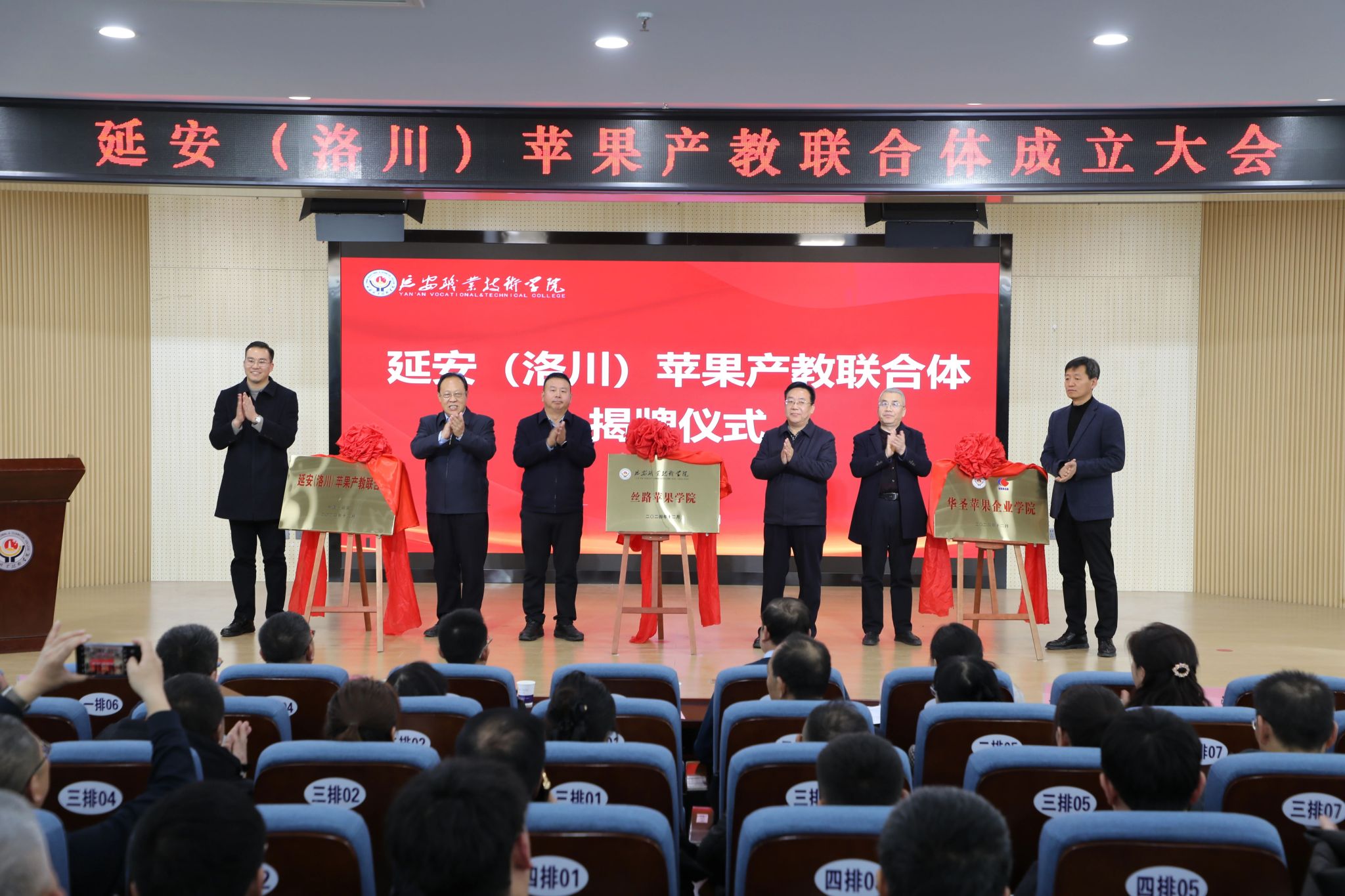 12月13日,延安(洛川)苹果产教联合体成立大会暨第一届理事会在延安职业技术学院召开。延安职业技术学院党委书记冯奇海出席并致辞。党委副书记、院长牛永红主持。学院副院长杜善保,洛川苹果现代产业园党委副书记、管委会主任王天锋,延安市果业中心副主任王建锋,延安华圣现代农业集团副总经理刘洋分别代表联合体相关方举行签约仪式。与会领导和嘉宾共同为“延安(洛川)苹果产教联合体”“丝路苹果学院”“华圣苹果企业学院”揭牌。市政府有关部门、洛川苹果现代产业园区、全市苹果产业企业等负责人,学院相关处室和农林与建筑工程系的师生代表参加大会。
