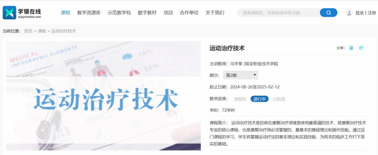 该课程充分利用现代信息技术手段,将复杂的运动治疗知识和技能转化为生动形象、易于理解和操作的在线课程资源。通过视频演示、案例分析、互动交流等多种形式,不仅让学生能够更加高效地掌握专业知识,也为广大老年群体提供了便捷的学习途径,有助于更好地了解和应用运动治疗方法来提升自身健康水平。
