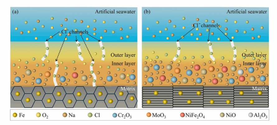 一直以来,传统马氏体-奥氏体双相钢(MADP)虽能在一定程度上实现高强度与高延展性的协同,然而其多相界面容易形成微电池效应,导致耐腐蚀性较差,这一缺陷严重限制了其在工业领域的广泛应用。而此次研究团队另辟蹊径,提出了一种创新的 “表面电负性氧化物与内部多界面协同保护” 策略,成功开发出纳米层双相钢(NL - MADP 钢)。这种新型钢材兼具超高强度、优异延展性和卓越耐腐蚀性,为海洋装备、桥梁等在严苛环境下工作的工程材料设计提供了全新的思路。