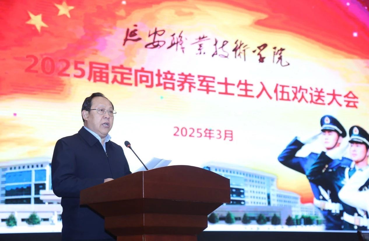 牛永红代表学院全体师生,向即将步入军营的军士生表示热烈祝贺,向为我院军士培养工作给予大力支持的北部战区海军训练基地、空军预警学院雷达士官学校、空军工程大学航空机务士官学校、延安军分区、武警延安支队及宝塔区武装部表示衷心的感谢,向为军士培养工作付出辛勤汗水的各位老师、辅导员及教官们致以崇高的敬意。