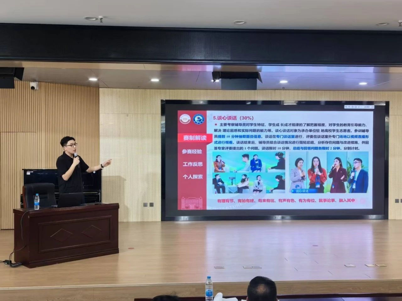 随后,綦玥老师带来《学赛互促强本领教学相长做榜样——从素质能力大赛反思辅导员素质能力提升的路径与方法》的精彩分享。綦玥老师曾获全国高校辅导员素质能力提升骨干训练营最高奖项“十佳标兵”(全国第五)、全国国家安全人民防线宣教比武“风采奖”(全国第七)、全国钢铁行业优秀共青团干部、陕西高校“表现突出辅导员”、陕西省团干部素质能力大赛一等奖、陕西省优秀共青团员等国家、省级奖项20余项。他根据自身参赛经历,从赛制解读、参赛经验、工作反思、个人探索等方面进行了详细地阐述,为辅导员提供了极具实操性的国赛和省赛经验分享。