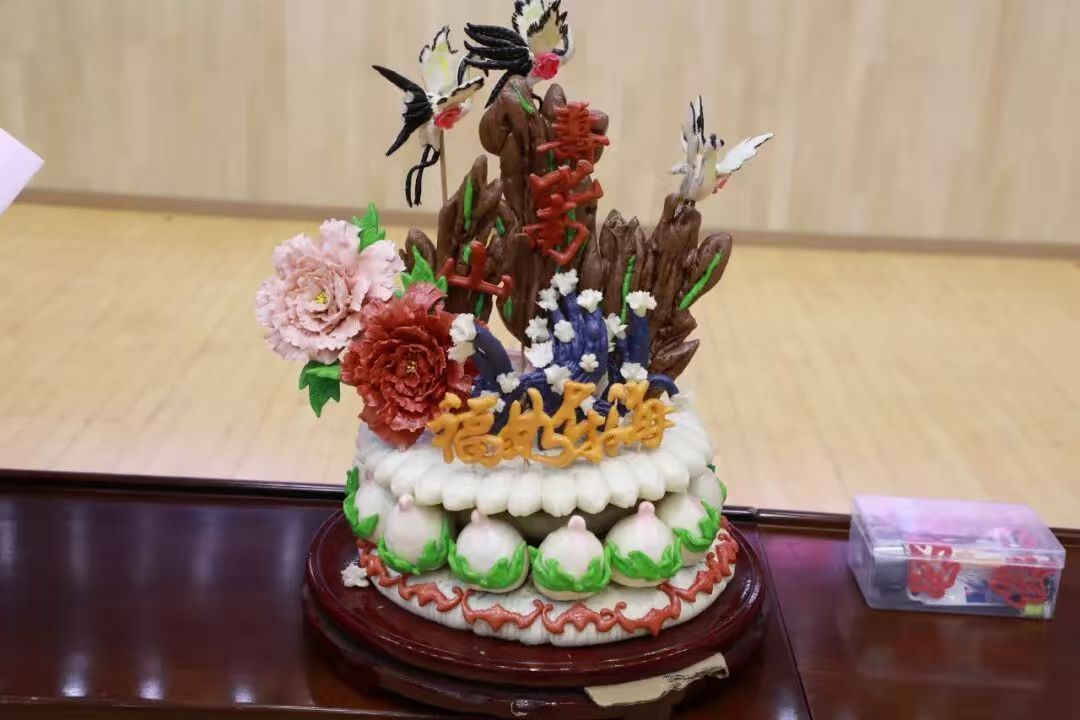 活动现场播放了非遗面花宣传片与吕晓燕老师的传承故事视频,生动的画面让师生们对花馍技艺有了更直观的认知。随后,吕晓燕老师向参与活动的领导老师献花,感谢大家对非遗文化的支持。学院领导、传承人及师生代表共同合影留念,定格下这一美好瞬间。