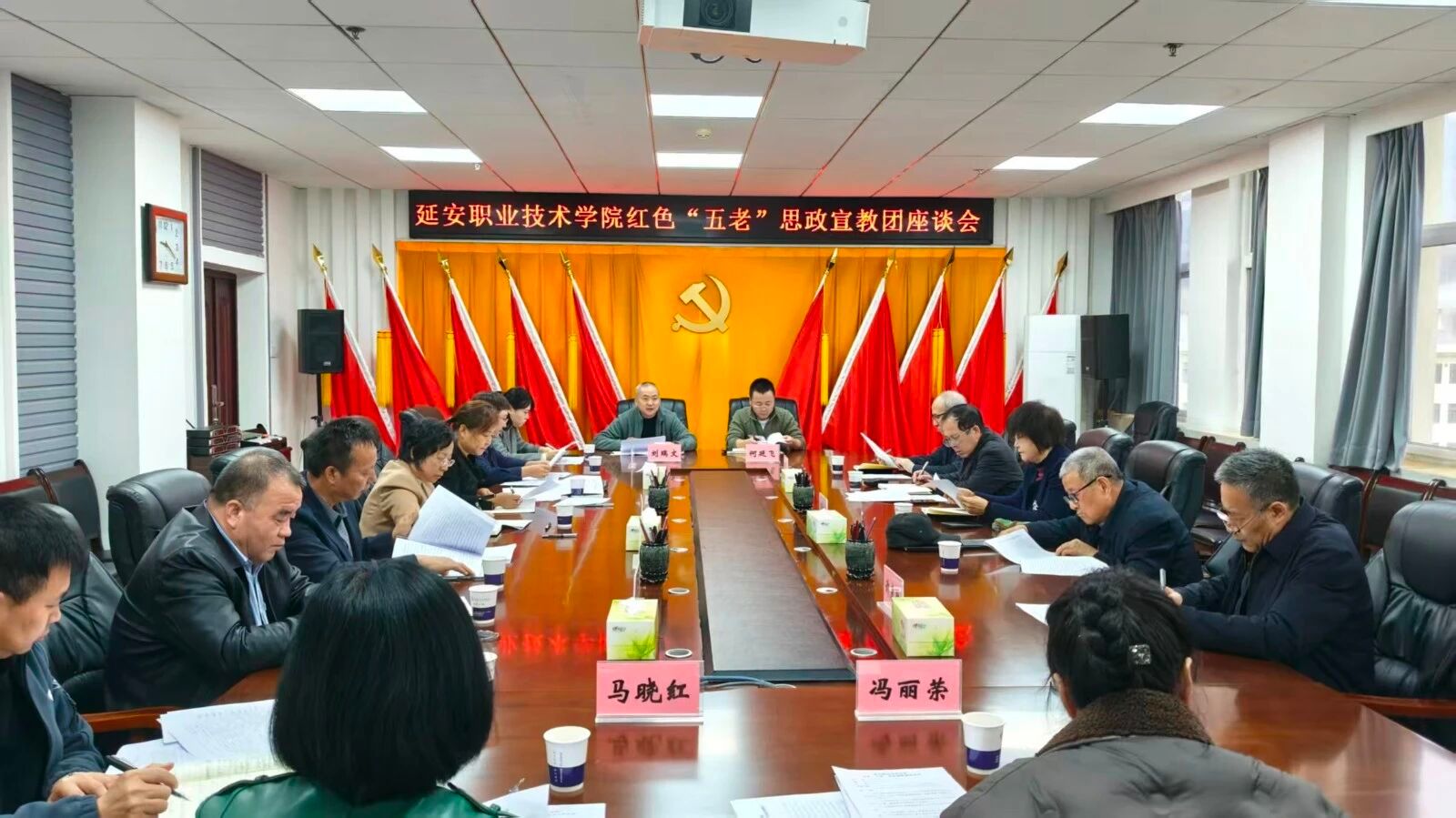 11月5日上午,延安职业技术学院召开红色“五老”思政宣教团座谈会,学院党委副书记党云萍出席并讲话。会议由党委委员、组织人事处处长任艳芳主持。学院红色“五老”思政宣教团团长兰培英及全体成员、离退处、学生处、团委负责人,马克思主义学院、电子信息工程系党总支书记参加。