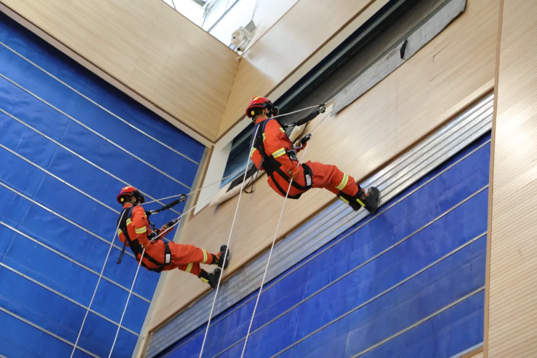 汇报活动在两支队列示范中拉开帷幕。在“绝活”展示环节,同学们操作无齿锯切割钢丝、液压扩张器夹取啤酒瓶,精准完成机动链锯开瓶盖等高难度动作,他们娴熟的操作引来现场阵阵掌声。生产事故应急救援技能展示中,同学们依托绳索救援装备,沉着完成高空破拆、伤员转运等科目,动作规范流畅、衔接紧凑,尽显扎实的实战素养。一旁的办学成果展板,全面呈现了学院在教学科研、技能大赛中的丰硕成果。特别值得一提的是,学生贾锦涛开发的消防特色网络游戏收到与会人员的一致好评。