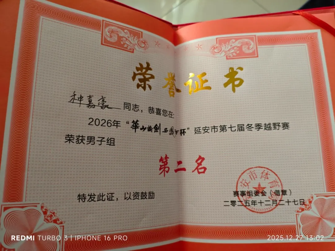 12月27日上午,“全民健身 运动三秦”2026年“华山论剑 西凤酒杯”延安市第七届冬季越野赛在东方红大道燃情开跑。延安职业技术学院消防救援学院学生种嘉豪以30分41秒的优异成绩跑完9公里全程,勇夺本次越野赛亚军。