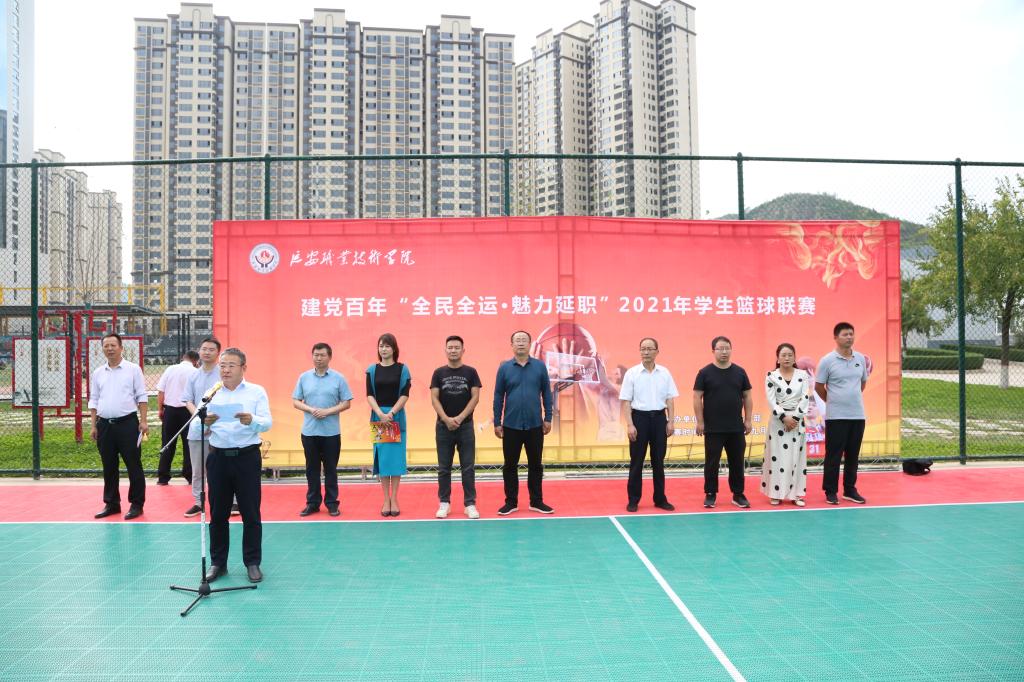 9月15日下午,延安职业技术学院庆祝建党百年“全民全运·魅力延职”2021年学生篮球联赛在学校篮球场开幕。副院长任杰出席并致开幕词,教务处、学生处、公共课教学部有关负责人,全体裁判员、各系(院、中心)运动员及师生代表参加开幕式。