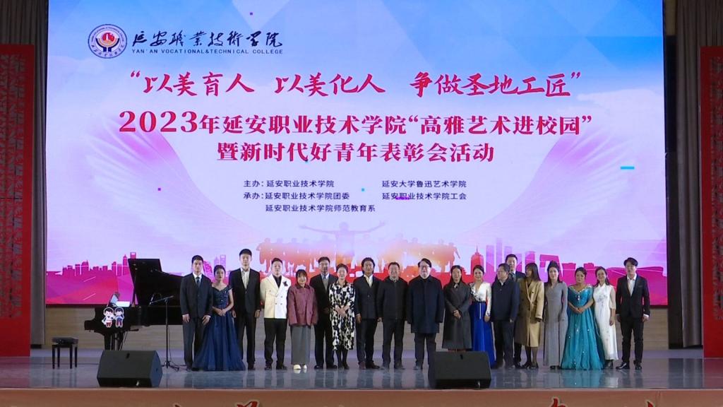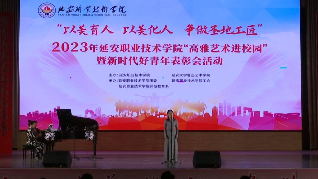11月23日晚,“以美育人、以美化人,争做圣地工匠”2023年延安职业技术学院“高雅艺术进校园”暨新时代好青年表彰会在大学生活动中心举行。院长全卫强等学院在家院级领导、各处室相关负责人及师生代表共1200余人观看演出。活动邀请了中国声乐家协会会员、陕北民歌传承人、延安大学鲁迅艺术学院教授等艺术家进行表演。