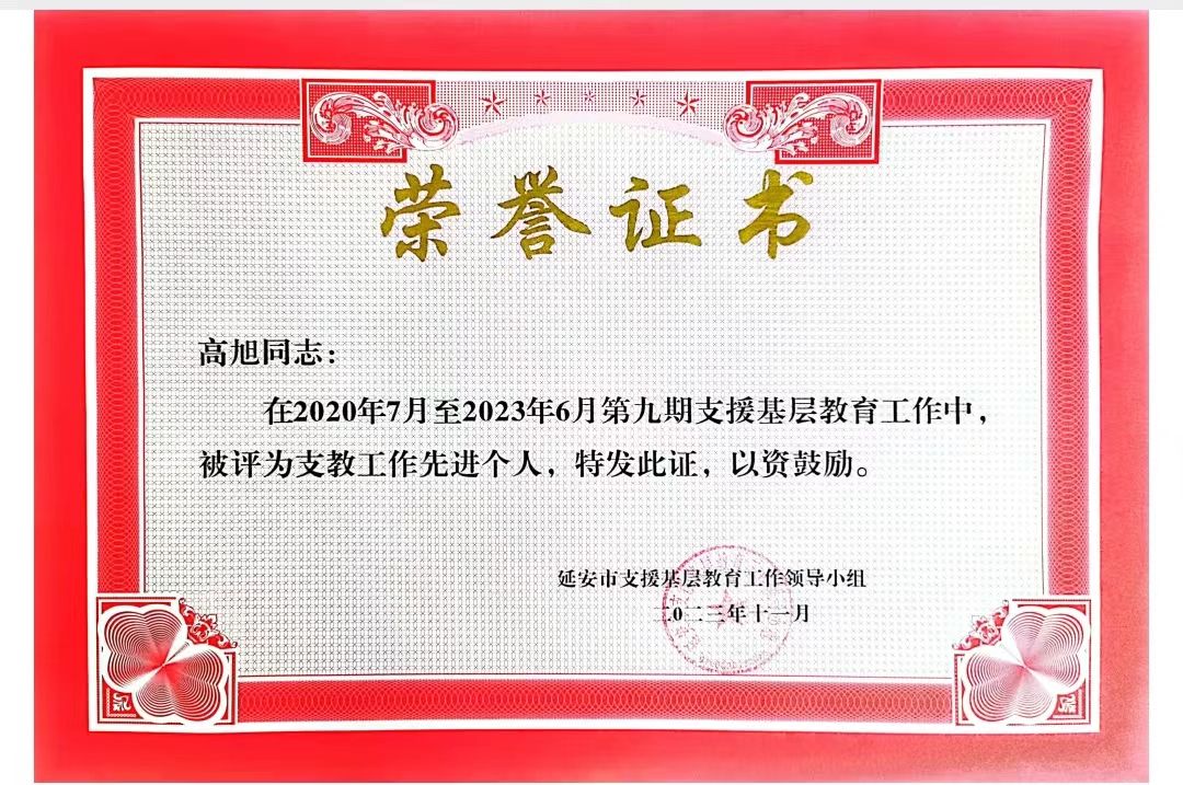 12月8日,延安市对口支援基层教育领导小组对第九期对口支援基层教育工作进行表彰,延安职业技术学院荣获先进集体,高旭、陈朋刚两位老师获先进个人。