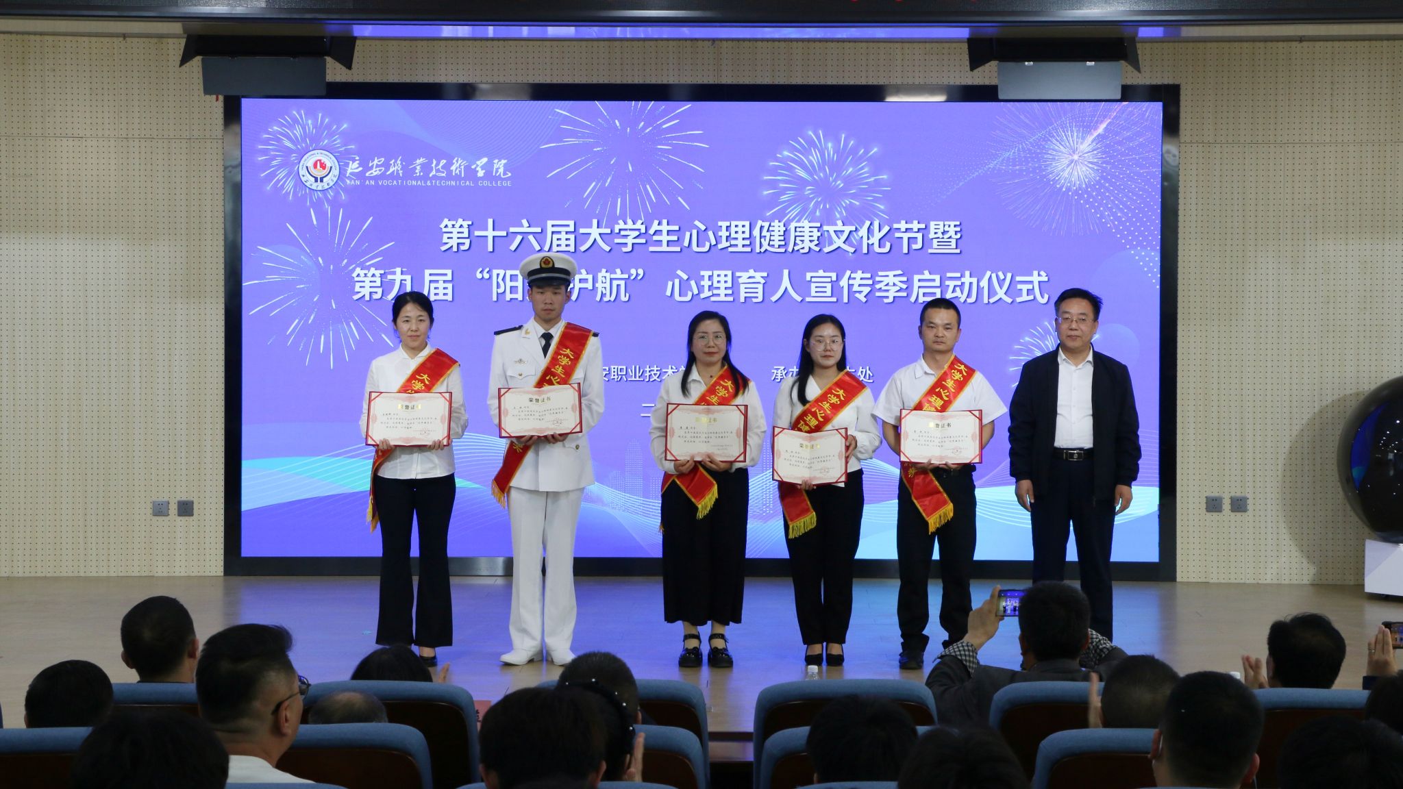 会议宣读了《关于表彰第十五届大学生心理健康文化节先进集体和优秀个人的决定》,与会领导为获得“先进集体”和“优秀个人”进行了颁奖,大会还对第十六届大学生心理健康文化节暨陕西省高校第九届“阳光护航”心理育人活动进行了安排部署。