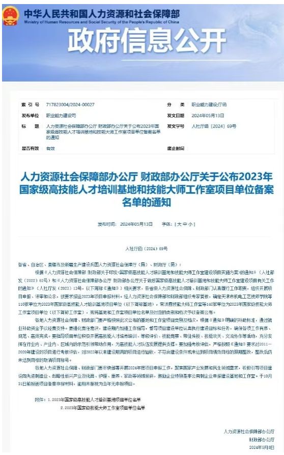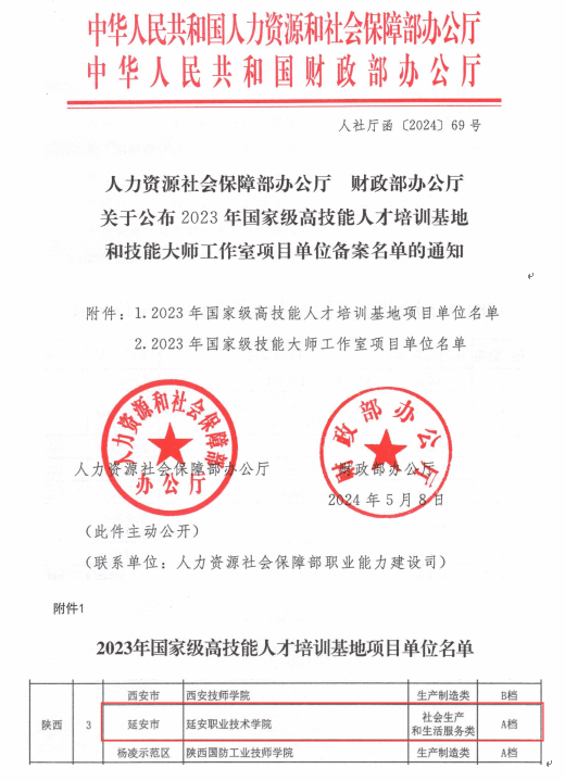 近日,人力资源和社会保障部办公厅、财政部办公厅发布了《关于公布2023年国家级高技能人才培训基地和技能大师工作室项目单位备案名单的通知》(人社厅函〔2024〕69号),延安职业技术学院成功入选为2023年国家级高技能人才培训基地项目单位(社会生产和生活服务类 A档)。