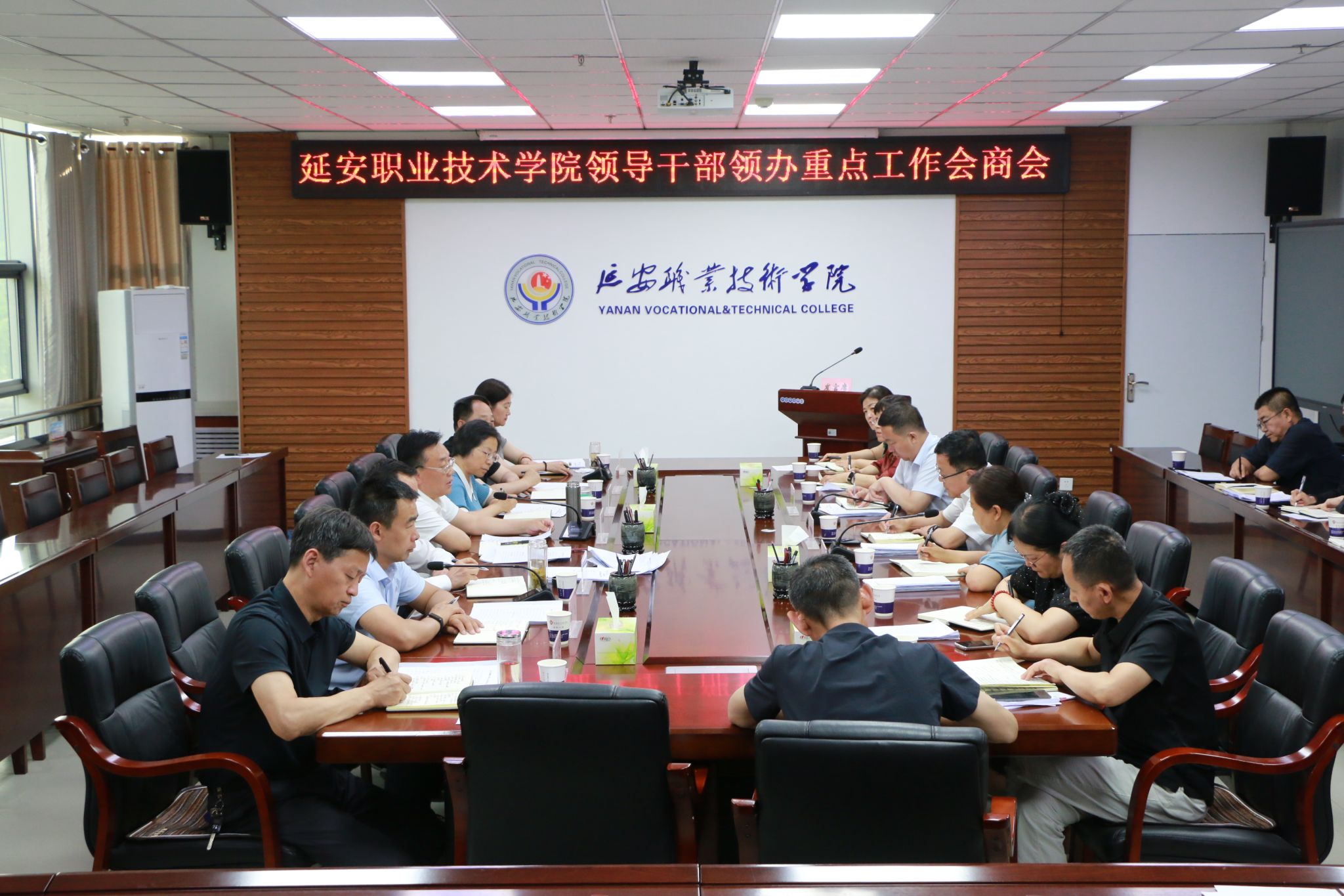 6月17日下午,延安职业技术学院召开领导干部领办重点工作会商会,学院党委书记冯奇海主持并讲话,各分管领导和主办部门负责人逐一汇报了各自领办重点工作推进情况。