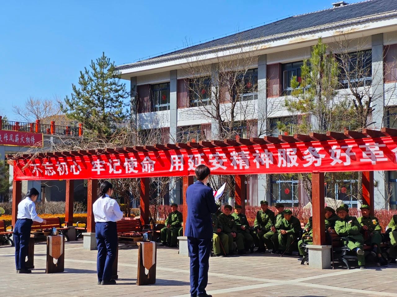 志愿服务活动以队列队形表演拉开序幕,国旗护卫队队员们用挺拔的身姿、嘹亮的口号、整齐的步伐展现了半军事化管理的优秀训练成果,悄然开启了退伍老战士们的回忆;一首励志歌曲《水手》,激昂的旋律、奋进的歌词,唱出了勇往直前的勇气和两代人的使命担当;优雅的“大红袍”茶艺表演,行云流水般的泡茶动作让老人们品味到传统文化的韵味;悠扬的竖笛独奏《牡丹花》,婉转的音符如春日微风,轻抚着每个人的心弦。