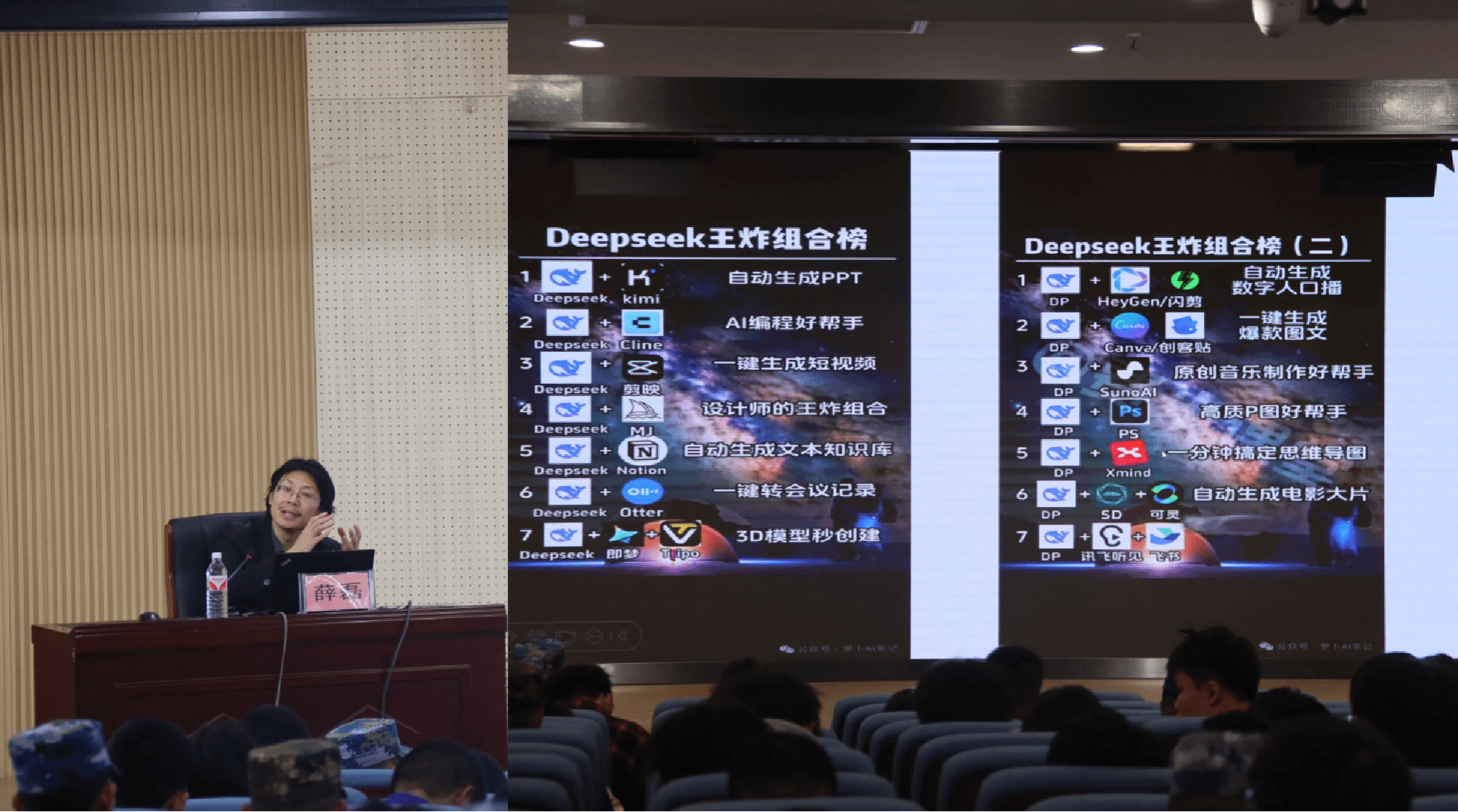 薛磊以生活场景切入,阐述AI技术发展现状,重点演示DeepSeek工具实操。通过角色扮演、案例辅助等文本生成功能,现场展示快速撰写报告、策划方案的高效性;结合信息检索与数据分析场景,凸显AI在复杂问题处理中的精准优势。讲座还就AI技术发展趋势展开探讨,鼓励学生将智能工具融入学习实践。
