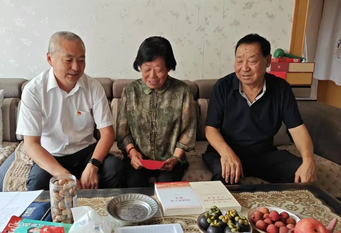 在党龄跨越半个世纪的老党员家中,工作人员为他们郑重佩戴上象征荣誉的纪念章。老党员们轻抚纪念章,难掩激动之情,纷纷表达对党的深厚感情与坚定信念。84岁的卢老师在病榻上艰难伸出大拇指表达敬意,此刻无声,初心如磐。慰问人员认真听取老党员们对学院发展的宝贵意见和建议,并郑重承诺将搭建平台,让他们的经验智慧持续发光发热,转化为推动学校前进的“银发力量”。