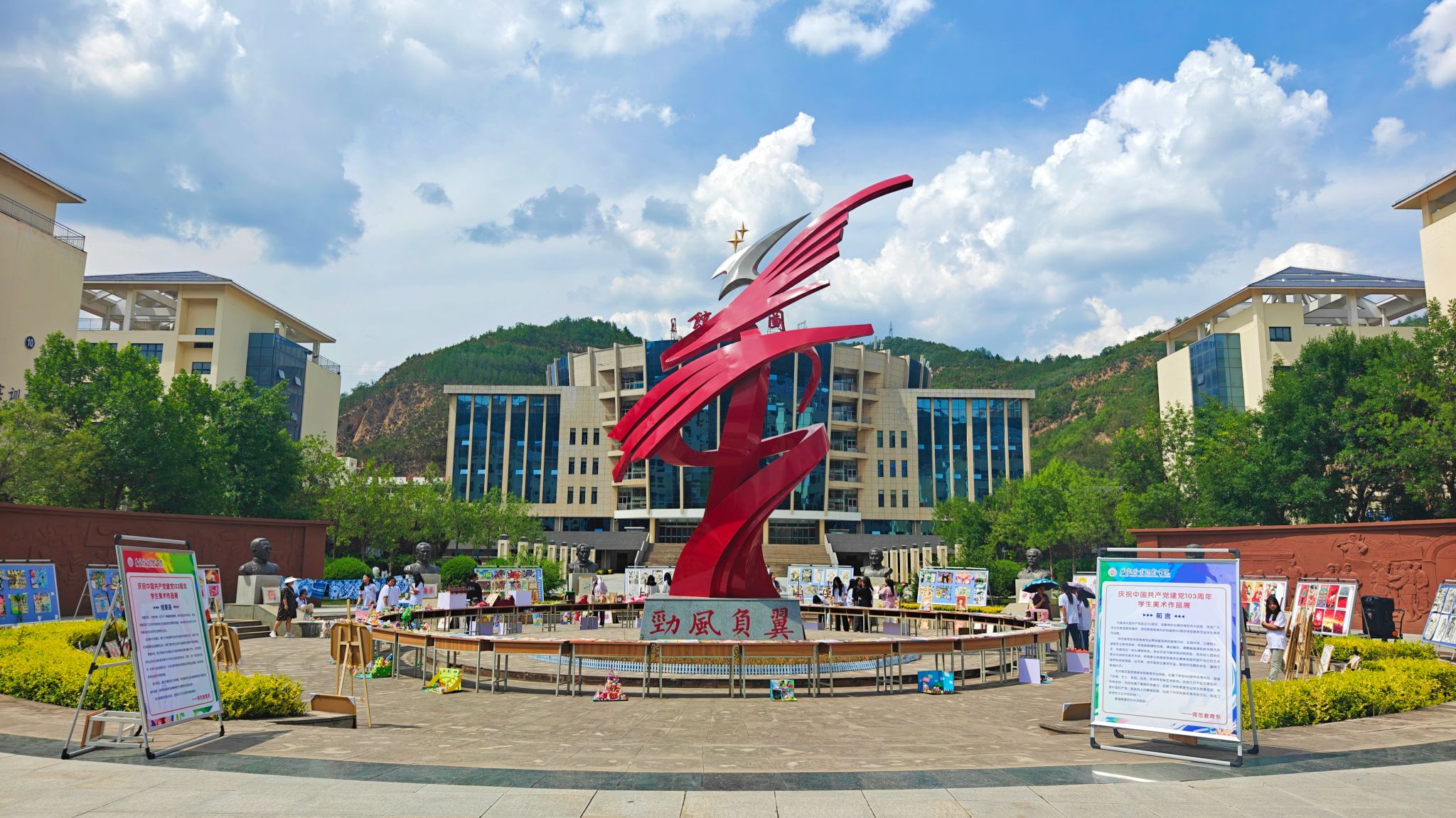 为喜迎中国共产党成立103周年,讴歌党的光辉历程和伟大成就,抒发广大学生的爱国爱党情怀,师范教育系举办庆祝建党103周年学前教育专业学生美术作品展。
