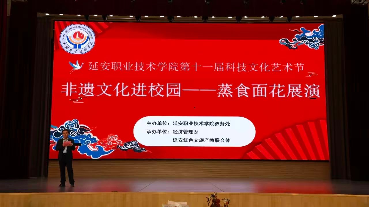 9月17日下午,延安职业技术学院第十一届科技文化艺术节“非遗文化进校园——蒸食面花展演”活动在大学生活动中心成功举办。学院党委副书记党云萍,党委副书记、纪委书记刘晓霞,党委委员、工会主席周景毅及师生代表近千人共同参加了本次活动。活动特邀韩城花馍非遗代表性传承人吕晓燕老师现场授课,旨在让师生近距离触摸非遗温度,推动传统文化在青春校园落地生根。