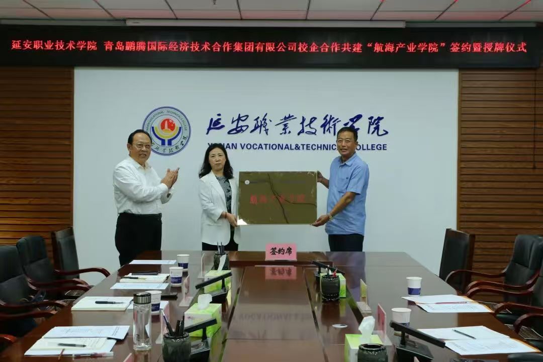 9月5日下午,延安职业技术学院与青岛鹏腾国际经济合作集团有限公司举行校企合作共建“航海产业学院”签约暨授牌仪式。学院党委副书记、院长牛永红,鹏腾集团董事长周君出席,副院长杜善保主持。学院教务处、招生就业处和航运工程系,鹏腾集团有关同志参加。